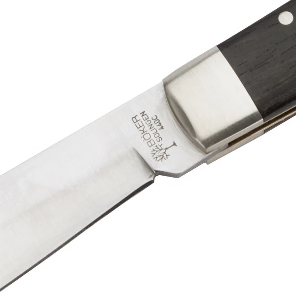 Herausgekommen ist ein formschönes Taschenmesser mit Griffen aus dunklem Ebenholz mit silberfarbenen Applikationen und eingelassenem Böker-Emblem. Die Clip-Point Klinge besteht aus 440C Stahl, der eine gute Schnitthaltigkeit aufweist und sich trotzdem gut schärfen lässt.