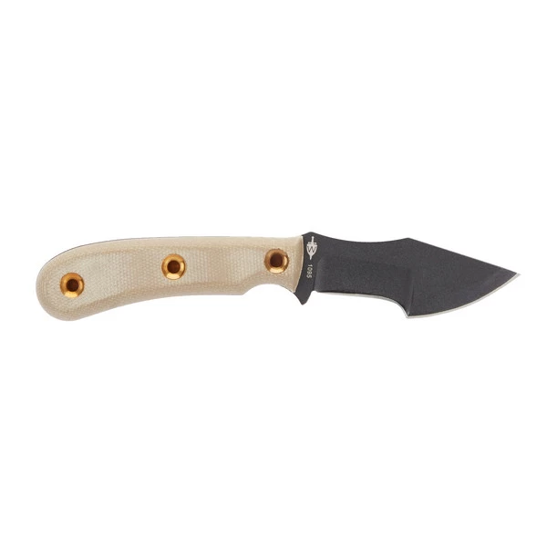 Ergänzt wird die Klinge durch einen 10 cm Micarta-Griff, der mit drei Messinghohlnieten ausgestattet ist. Die Hohlniete am Griffende kann als Fangriemenöse genutzt werden. Für den sicheren Transport liegt dem Messer eine passgenaue Scheide aus Kydex bei. Alles zusammen wird in einer hochwertigen Geschenkbox geliefert.