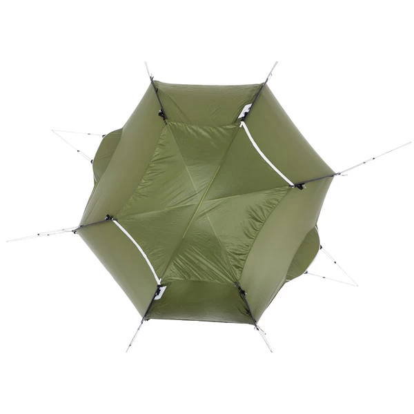 Das Außenzelt ist freistehend. Es sind bei milder Witterung also keine Heringe zum Aufbau notwendig und das Zelt kann beliebig oft umgestellt werden, bis ein geeigneter Standplatz gefunden ist. Falls die reflektierenden Abspannleinen doch benötigt werden, so lässt sich das Keb Dome durch Einsatz der langen Leinen und Doppelspannern selbst mit vergrabenen Skiern oder Schneeschuhen abspannen.