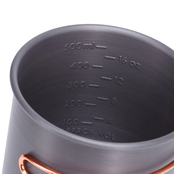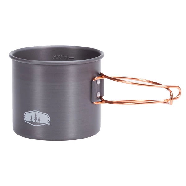 Großer Becher aus hartanodisiertem Aluminium, den du auch als kleinen Kochtopf verwenden kannst. Die kontrastfarbenen Griffe können platzsparend umgeklappt werden.