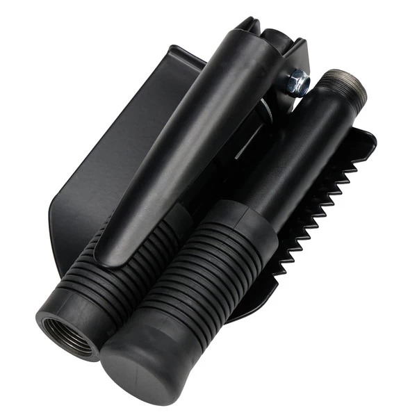 Das kleine Packmaß wird durch den schraubbaren Griff erreicht, der sich in der Mitte teilen lässt. Der Kunststoffgriff liegt bei jeder Arbeit sicher und rutschfest in der Hand. Das Schaufelblatt und die Hackspitze aus rostfreiem A3-Stahl können im 90-Grad-Winkel zum Griff gestellt werden. So aufgebaut lockerst du selbst festen Boden mühelos auf.