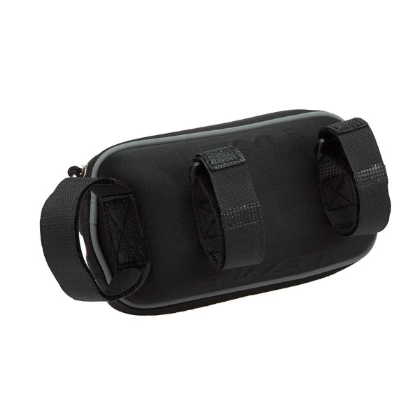 Die Tasche wird mit drei Klettverschlüssen am Rahmen befestigt. Die von unten gummierten Klettverschlüsse verhindern ein Verrutschen der Tasche am Oberrohr, ein Klettverschluss wird am Steuersatz befestigt und sorgt dafür, dass die Tasche nicht nach unten kippt. Ein wasserdichter Reißverschluss schützt den Inhalt zudem zuverlässig vor Spritzwasser.