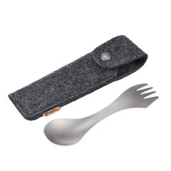 Ultraleicht und besonders edel. Der Spork aus Titan wiegt lediglich 19 g und wird in einer hochwertigen Tasche aus recycelter Merinowolle (von Woolpower) geliefert.