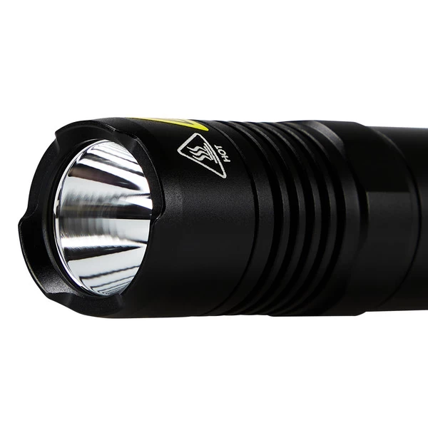 Taktische Taschenlampe mit Endkappenschalter, 3 Benutzermodi und Direktzugriff auf den Stroboskop-Modus. Robuster Lampenkörper aus HA III Aluminium, wasserdicht nach IP68.