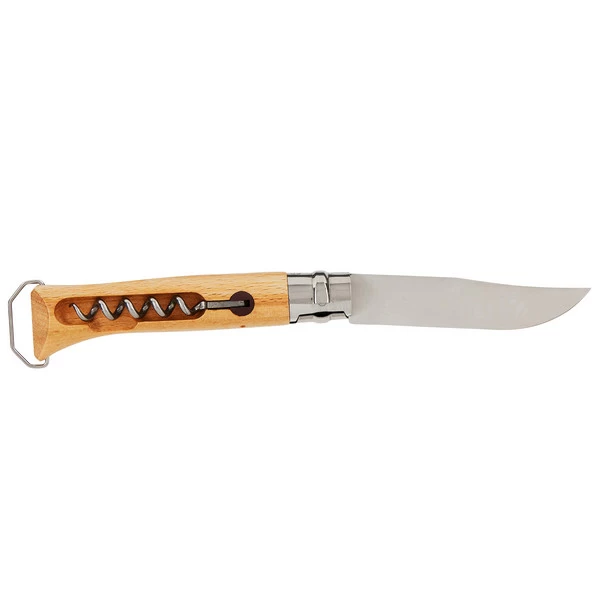 Der Griff verfügt über einen eingebauten Korkenzieher, der sich im 90-Grad-Winkel ausklappen lässt. Er bietet einen festen Griff dank des Buchenholzgriffs und ermöglicht das mühelose Entkorken von Flaschen. Zusätzlich befindet sich am Griffende ein Flaschenöffner.