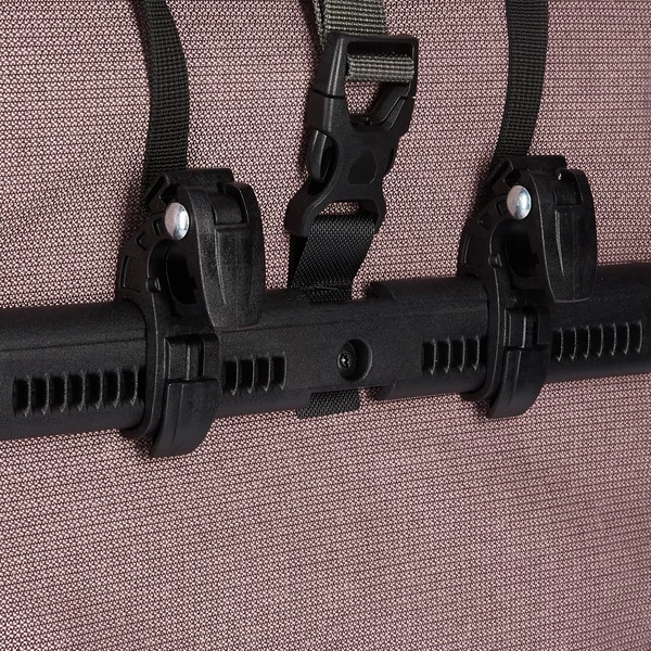 Aufhängung für Gepäckträger mit einem Rohrdurchmesser von 8 bis 16 mm. Die beiden oberen Haken lassen sich werkzeugfrei auf der aus einem Stück gefertigten Schiene verschieben und durch Anheben des Tragegriffs öffnen. Der untere Arretierungshaken ist ebenfalls auf einer halbelliptischen Schiene individuell anpassbar und werkzeugfrei in 15-Grad-Schritten drehbar. Ein Scheuerschutz im unteren Bereich der Taschen und an der Auflagefläche des Gepäckträgers beugt Abrieb vor.