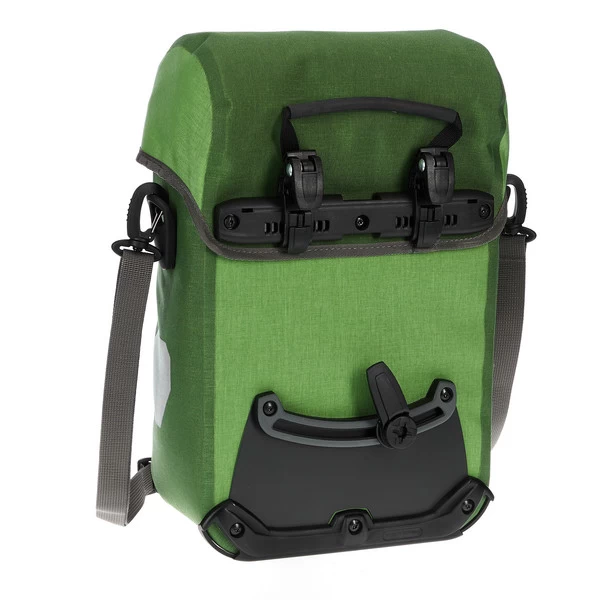 Aufhängung für Gepäckträger mit einem Rohrdurchmesser von 8 bis 16 mm. Beim QL2.1-System wurde die Schiene mit den Befestigungshaken an der Taschenrückseite überarbeitet. Die beiden oberen Haken lassen sich werkzeugfrei auf der nun aus einem Stück gefertigten Schiene verschieben und durch Anheben des Tragegriffs öffnen. Der untere Arretierungshaken ist ebenfalls auf einer halbelliptischen Schiene individuell anpassbar und werkzeugfrei in 15-Grad-Schritten drehbar. Ein Scheuerschutz im unteren Bereich der Taschen und an der Auflagefläche des Gepäckträgers beugt Abrieb vor.