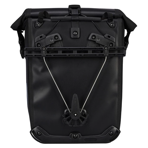 Aufhängung für Gepäckträger mit einem Rohrdurchmesser von 8 bis 16 mm. Beim QL2.1-System wurde die Schiene mit den Befestigungshaken an der Taschenrückseite überarbeitet. Die beiden oberen Haken lassen sich werkzeugfrei auf der nun aus einem Stück gefertigten Schiene verschieben und durch Anheben des Tragegriffs öffnen. Der untere Arretierungshaken ist ebenfalls auf einer halbelliptischen Schiene individuell anpassbar und werkzeugfrei in 15°-Schritten drehbar. Ein Scheuerschutz im unteren Bereich der Taschen und an der Auflagefläche des Gepäckträgers beugt Abrieb vor.