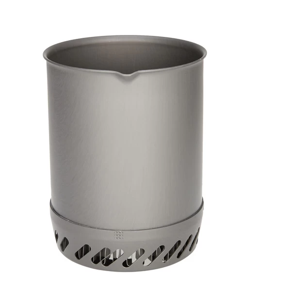 Der Topf fasst 500 ml und ist mit einer isolierten Topschutzhülle mit Henkel versehen. Mit nur einer Drehung lässt er sich fest mit dem Brenner zu einer Einheit verbinden. Dadurch wird ein effizienter Abstand hergestellt, der den Gasverbrauch minimiert. Auch der integrierte Windschutz, der transparente Kunststoffdeckel und der Wärmetauscher am Topfboden sorgen für einen effizienten Betrieb.