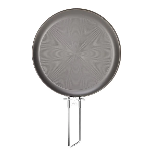 Leichte Pfanne aus hartanodisiertem Aluminium und kratzfester Keramik-Antihaftbeschichtung auf der Innenseite. Der Griff kann platzsparend an den Pfannenboden geklappt werden.