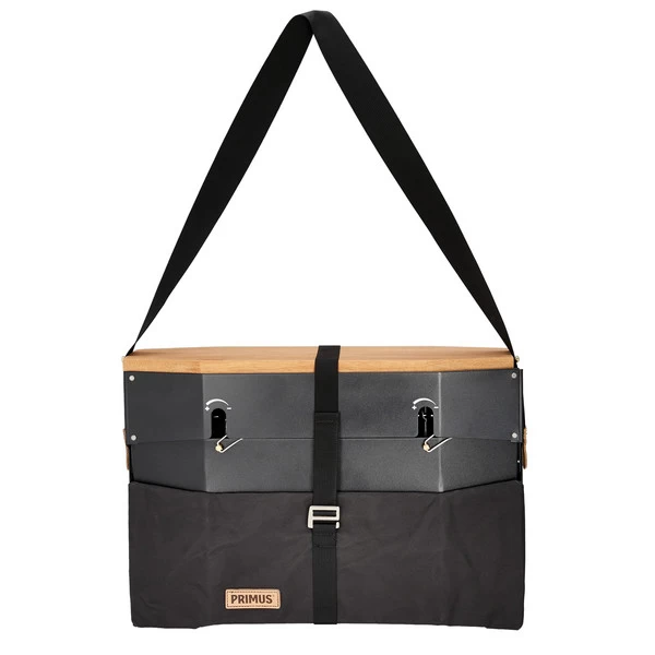 Oben wird der Kocher mit einer kräftigen Holzplatte abgedeckt, die durch den Schulterriemen beim Transport fixiert wird. Die Abdeckplatte aus Eichenholz kannst du universell einsetzen, zum Beispiel als Schneidebrett oder Servierplatte. Die Seiten des Kochers sind unten mit robustem, textilem Gewebe bezogen. Es ist per Klett befestigt und lässt sich zum Reinigen leicht abnehmen. Leder-Applikationen, Stahlschnalle und Messing komplettieren den feinen Look dieses Kochers.