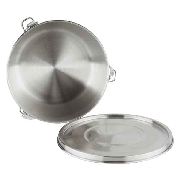 Schüssel aus 18/8 Edelstahl, ausgestattet mit einem Deckel, der mit drei Bügelverschlüssen sicher in Position gehalten wird. Der Deckel ist mit einer BPA-freien Gummidichtung ausgestattet.