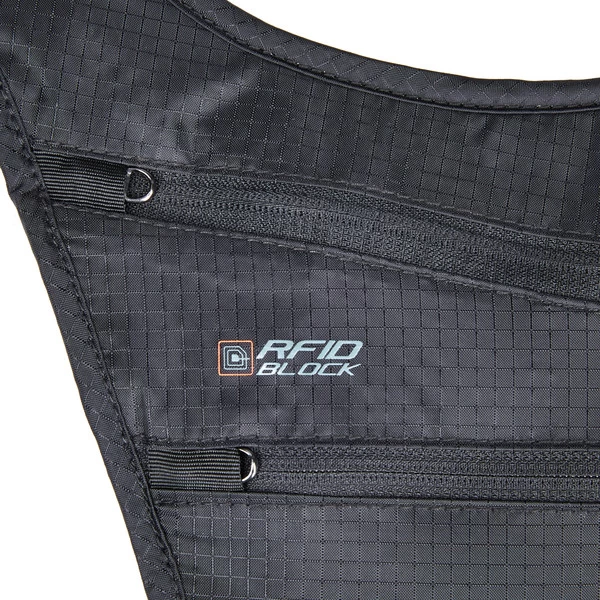 Das Skin Chest Holster RFID B trägst du seitlich am Körper. In die beiden RV-Fächer passen deine Wertsachen und der Reisepass. Das RFID-blockierende Material schützt dabei deine Daten.