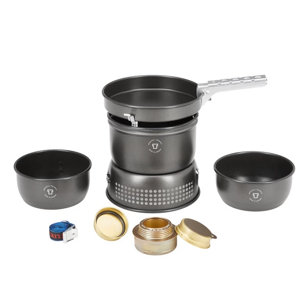 Original Trangia Spiritus-Brenner, Aluminium-Untergestell, Aluminium-Windschutz mit Topfhalterung, Brenner, 1 L inner und 1 L outer Topf, Pfanne 180 mm Ø, Griffzange und 61 cm Spanngurt.