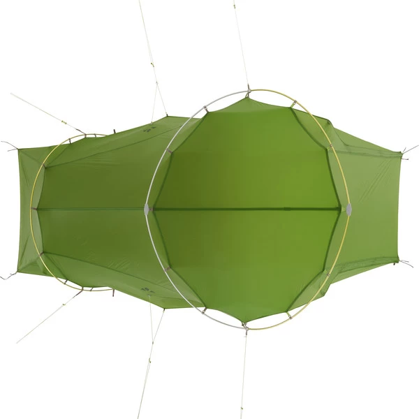 - Außenzelt und Innenzelt werden durch außenliegendes Gestänge gleichzeitig aufgebaut